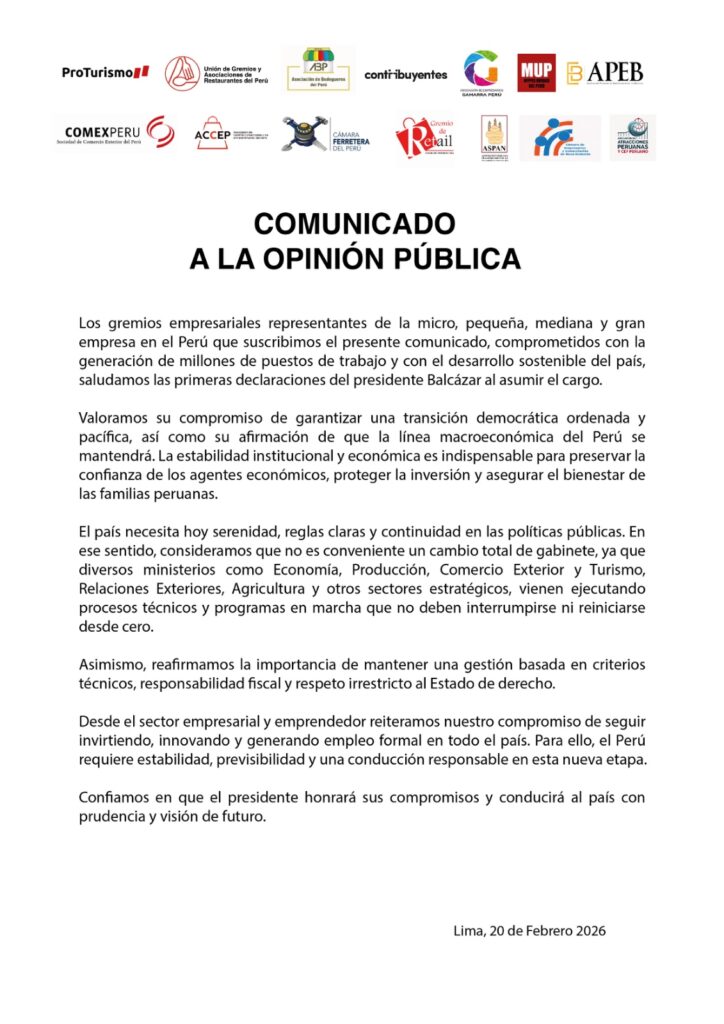 “La estabilidad institucional y económica es indispensable para preservar la confianza de los agentes económicos, proteger la inversión y asegurar el bienestar de las familias peruanas”, señala el comunicado.